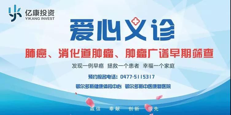 亿康投资集团旗下医疗机构,鄂尔多斯健康体检中心、鄂尔多斯中医康复医院继2018年成功举办“肿瘤筛查大型公益义诊”活动后,引起社会的一致好评,为再次回馈社会各界的鼎力支持和帮助,将于4月10-11日开展“行政事业单位免费肿瘤早期筛查”活动,鄂尔多斯市各行政事业单位人员,均可凭工作证预约报名参加。