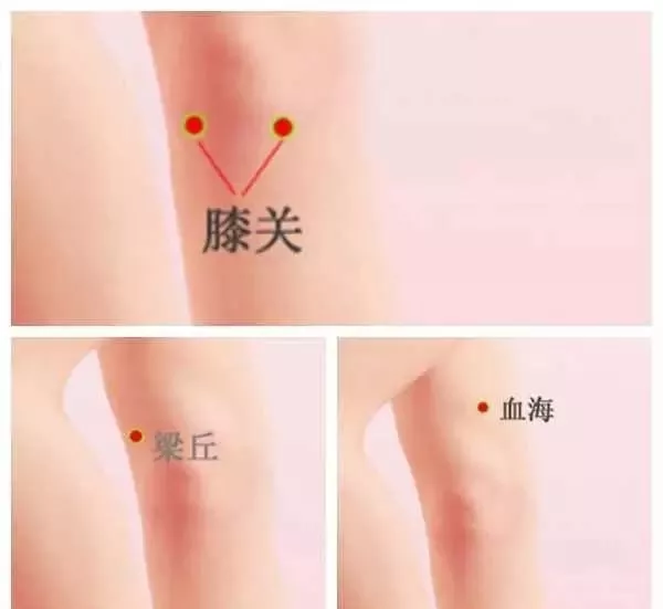 ▲内外膝(膝盖窝下面两个眼)、血海(膝盖上面两指内侧)、梁丘(膝盖上两指外侧)用力按,对髌骨软化很有作用。