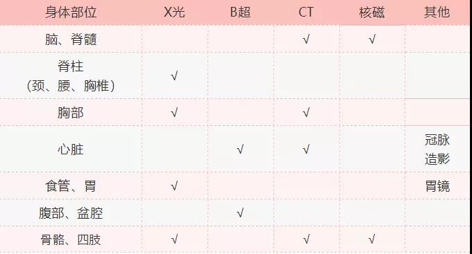 另外,不同身体部位常用的检查手段也有很大不同。一张图告诉你,以后做检查就可以对号入座了: