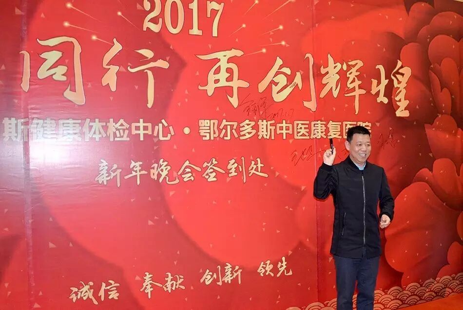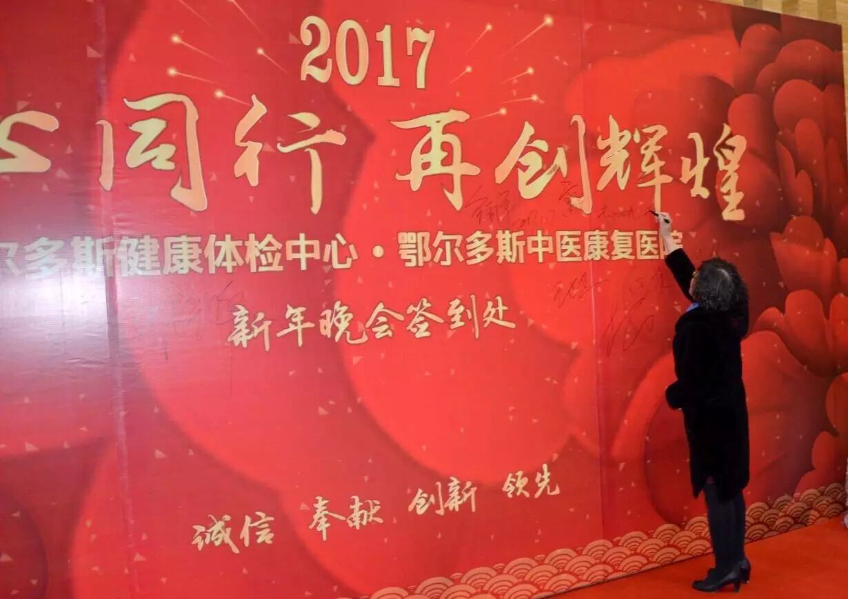 傍晚18时,“同心同行 再创辉煌”——鄂尔多斯健康体检中心、鄂尔多斯中医康复医院2017年新年晚会正式拉开序幕。今年的晚会特别设置了“星光大道”入场仪式,每位领导和员工盛装出席,并在签名墙上签名留念。